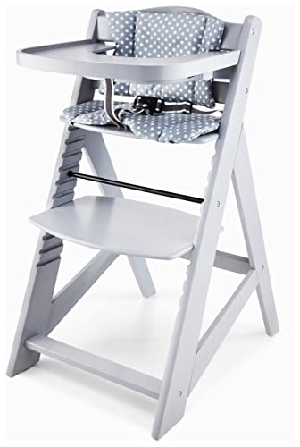KikkaBoo Chaise Haute Bébé Évolutive en Bois NORDY, Bois de Hêtre, Réglable jusqu’à 35 kg, Plateau Amovible, Siège et Repose-Pieds Réglables, Harnais 3 Points, Gris Foncé