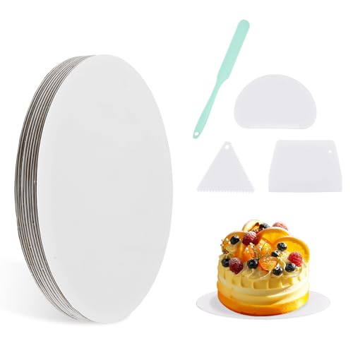10 Pièces Plateau Gâteau Rond, Cake Board 30 cm x 3 mm, Support Gâteau avec Grattoir et Spatule Silicone, Disque Gateau Blanc, Planches à Gâteau pour Mariage Anniversaire Fête