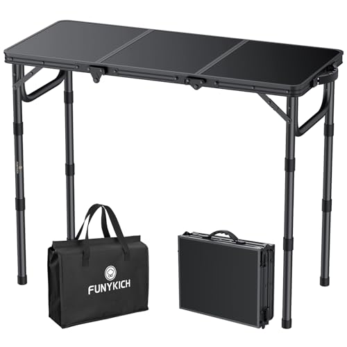FUNYKICH Table d'Extérieur/Camping Pliante 87x40cm (3 Hauteurs : 26.2/48.1/70cm) en Aluminium Léger avec Plateau MDF Portable et Stable Capacité 66lbs - Idéale pour Pique-Nique,Barbecue,Jardin (Noir)