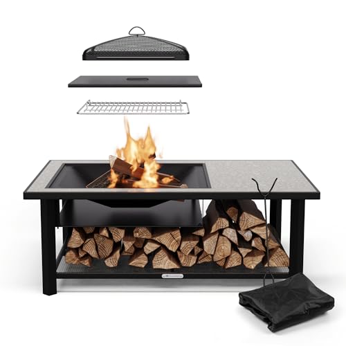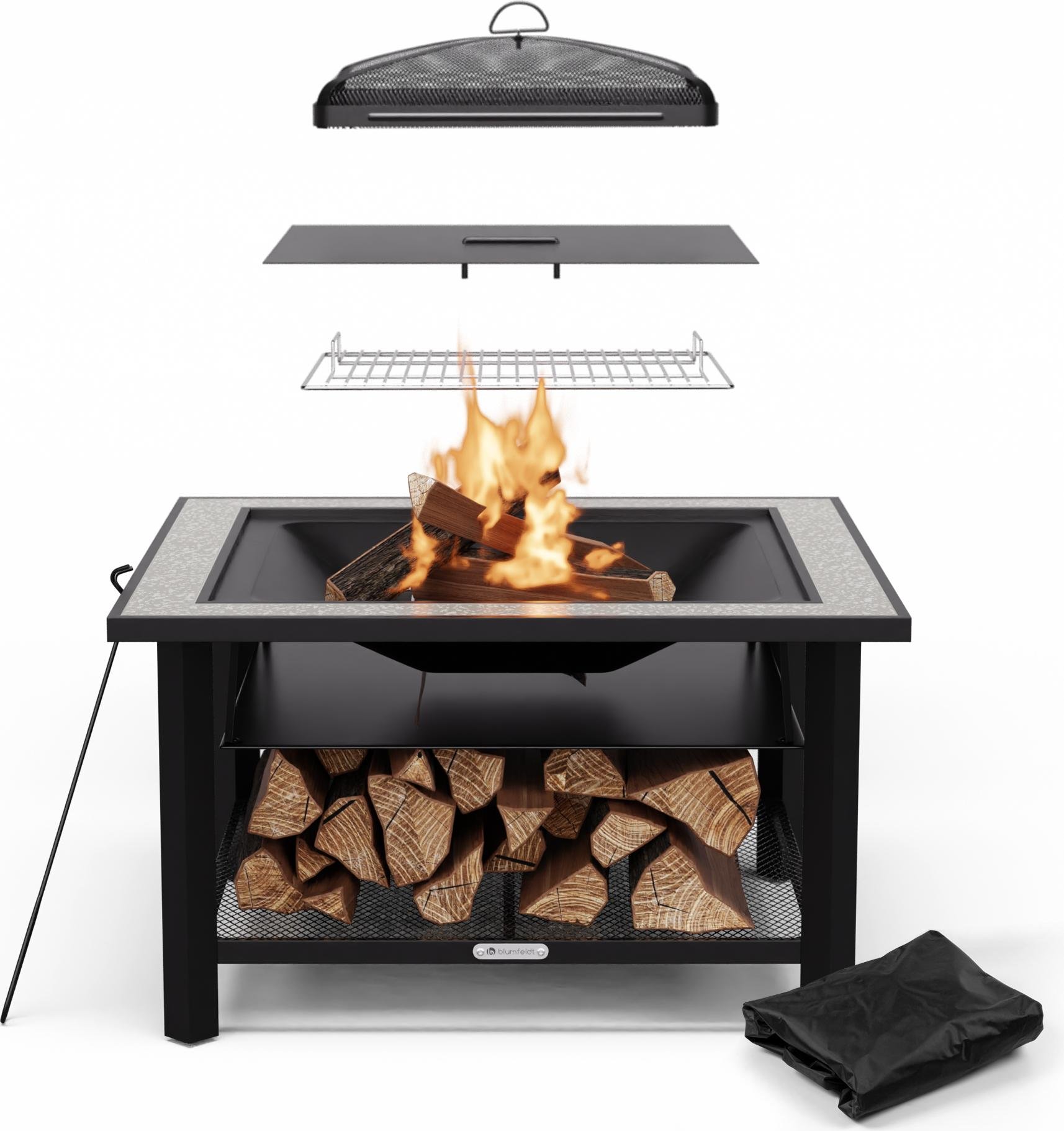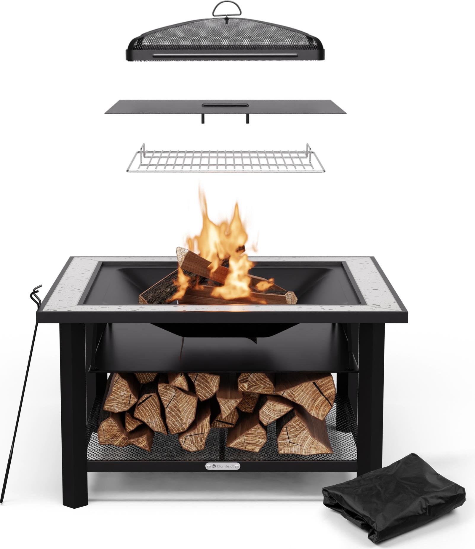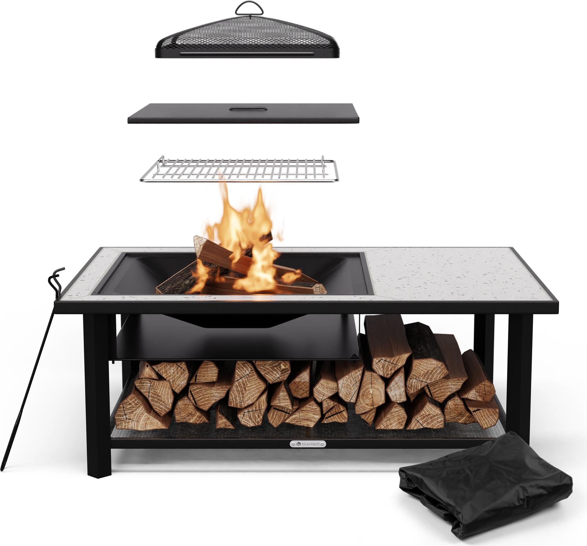Blumfeldt Merano Avanzato Brasero Exterieur - 3-en-1 Brasero, Barbecue & Table, Plateau en Terrazzo, Cadre en Acier Robuste, Pare-Étincelles, Grille & Tisonnier Inclus, Idéal pour Jardin & Terrasse
