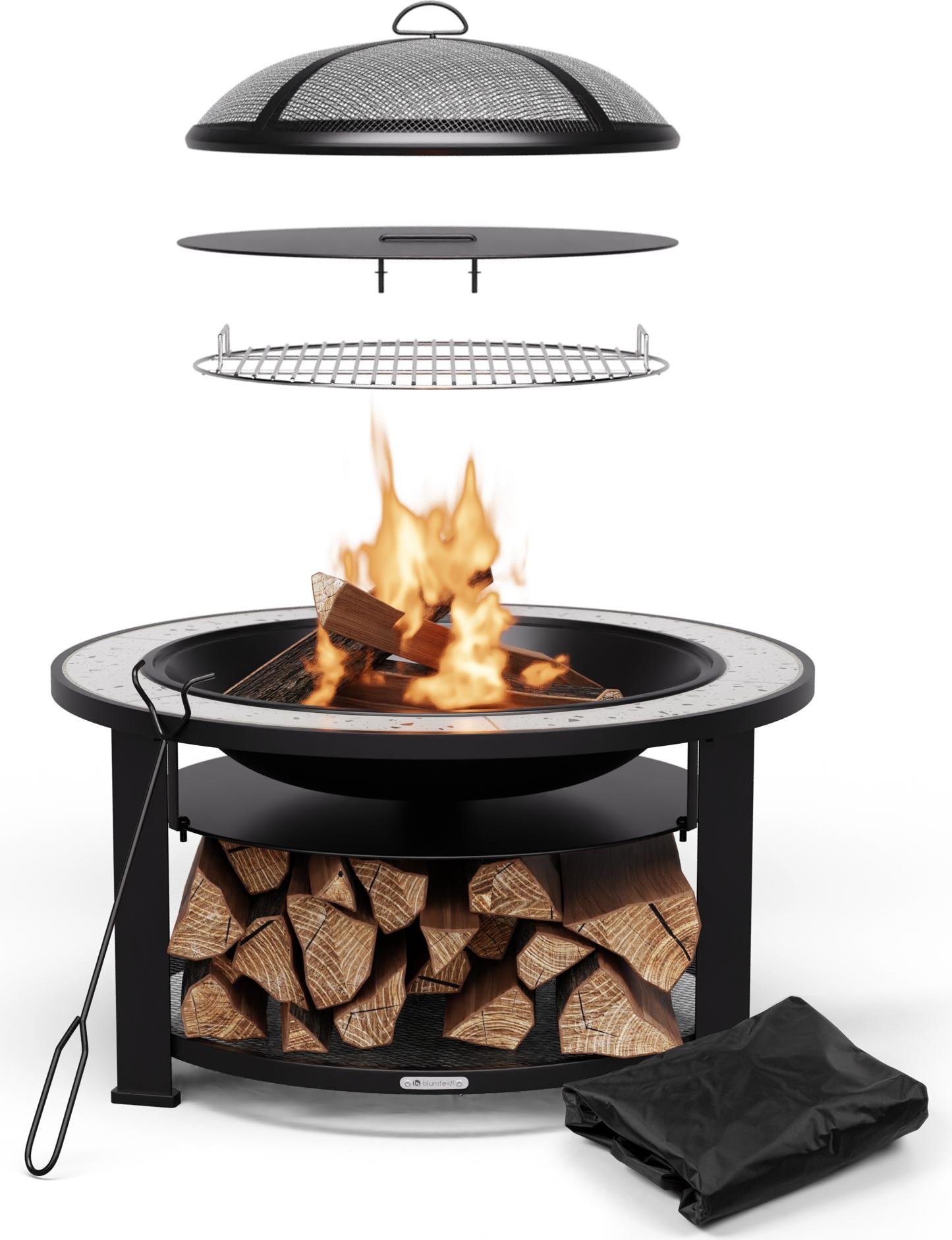 blumfeldt Merano Circolo Brasero Exterieur - 3 en 1 Brasero, Barbecue & Table, Cadre en Acier Robuste, Plateau en Terrazzo, Grille, Tisonnier & Pare-Étincelles, Idéal pour Jardin & Terrasse