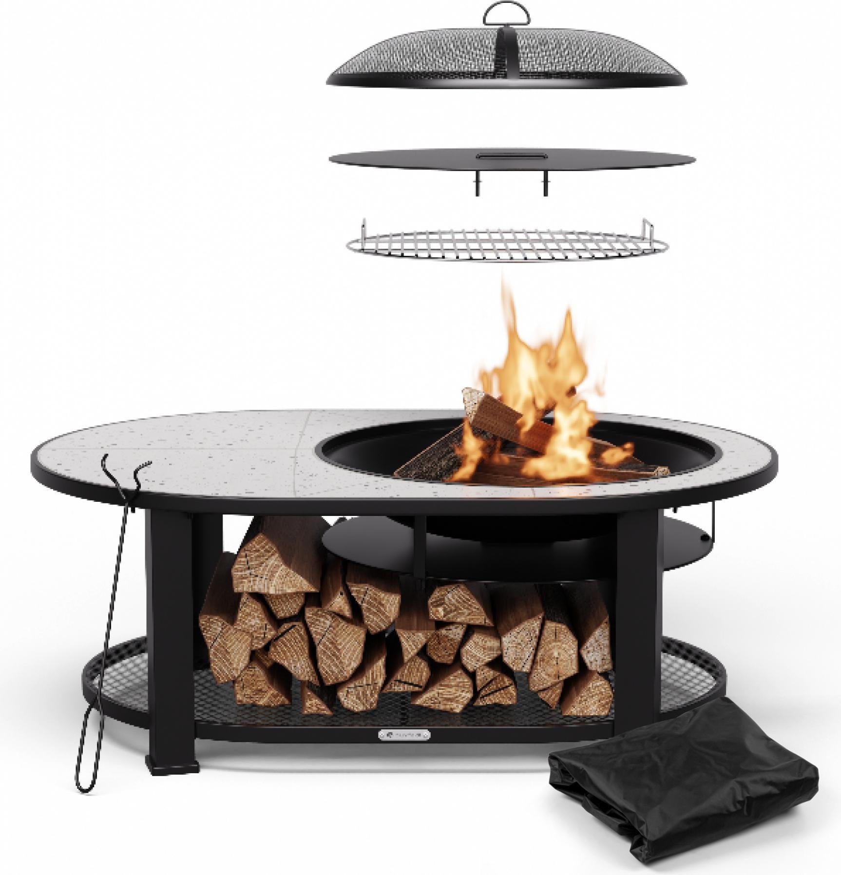 Blumfeldt Merano Circolo Brasero Exterieur - 3 en 1 Brasero, Barbecue & Table, Cadre en Acier Robuste, Plateau en Terrazzo, Grille, Tisonnier & Pare-Étincelles, Idéal pour Jardin & Terrasse