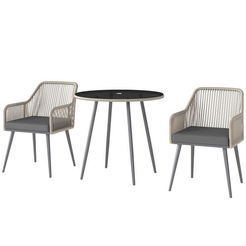 Salon de jardin 3 pièces 2 places avec coussins plateau table verre trempé noir résine filaire gris