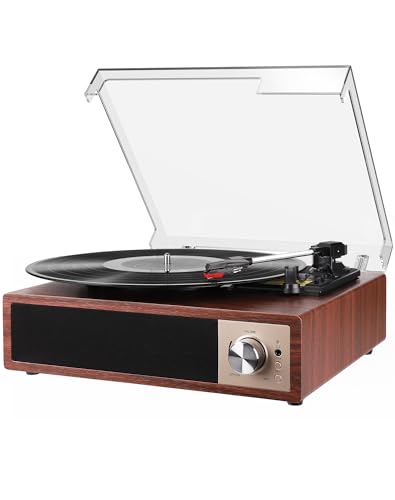 Platine Vinyle, FYDEE Tourne-Disque Vinyle Bluetooth Portable avec 3 Vitesses 33/45/78 TR/Min, Haut-Parleurs Intégrés, Prise 3.5mm, Sortie RCA, Entrée AUX - Noyer Noir