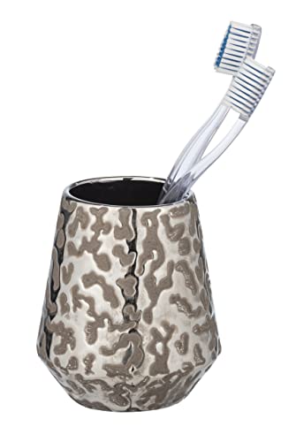 WENKO Porte-brosses à dents Burgos en céramique haut de gamme avec jeu de motifs brillant, gobelet à brosser les dents extravagant de Ø 9,1 x 10,5 cm, accessoire de salle de bain pour les brosses à dents, surface structurée, gris-marron/platine