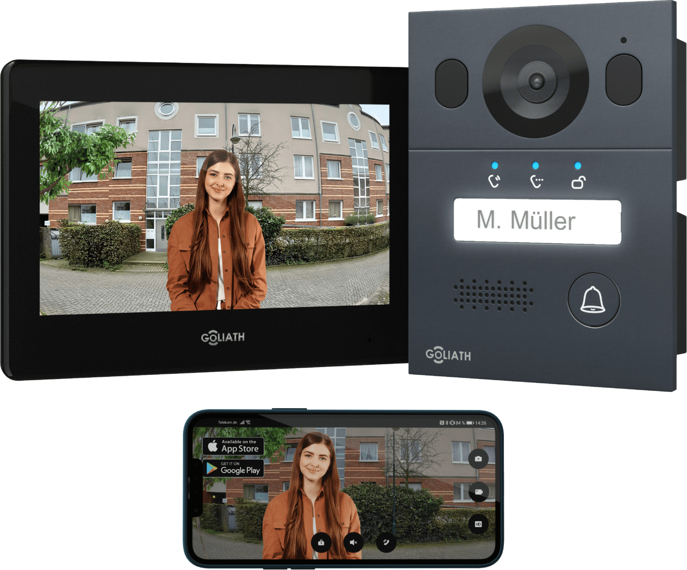 GOLIATH Basic interphone vidéo, bus 2 fils, écran 7", sonnette de porte encastrée avec caméra, interphone avec ouvre-porte et sonnette, maison 1 famille, Plug & Play, Smartphone App, AV-BLS-02U