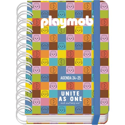 Dohe - Agenda Scolaire 2025 2026 - Page Par Jour, Taille A6 (12x17 cm), Espagnol et Anglais, Fermeture à Spirale Double et Élastique, Couverture Rigide, 4 Pages d'Autocollants - Playmobil Unite As One