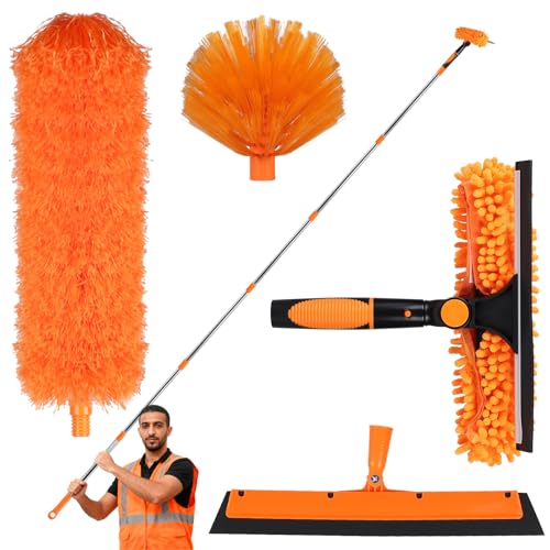 LALAGO Plumeau Telescopique, Kit de Nettoyage Inclus Tige Extensible 1,5-4,5m, Balai Araignée Tete de Loup Telescopique, Raclette Vitre 2 en1, Tête de Plumeau en Chenille pour Plafonds, Stores (Set A)