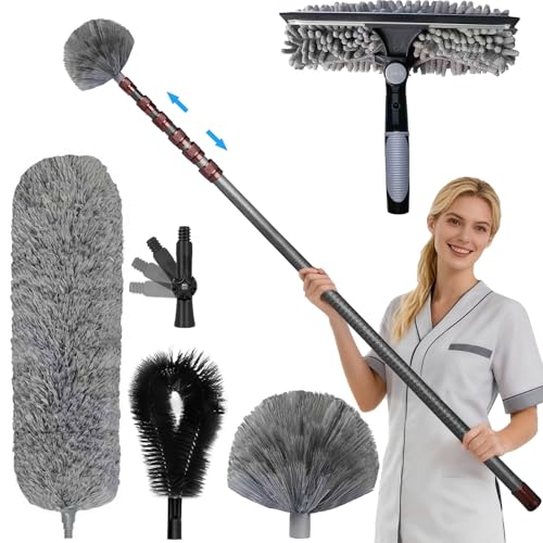 Tete de Loup Telescopique 6m, Telescopique Plumeau avec Manche en Fibre de Carbone de 1,5 à 6,5m, Comprend Tete de Loup pour Plafonds et Coins, Plumeau Anti-Toiles d’Araignée, Raclette de Fenêtre