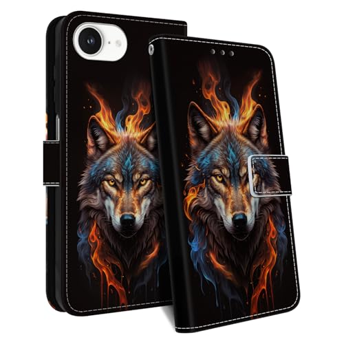 HopMore Coque pour iPhone 16e Housse en Cuir PU Premium Etui à Rabat Antichoc Flip Case Cover Porte Carte Pochette Portefeuille Étui de Protection avec Motif pour iPhone 16e, Loup B