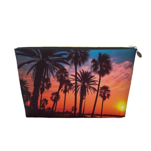 KKLWEGU Trousse de maquillage en cuir PU étanche avec motif palmier et coucher de soleil - Trousse de toilette de voyage - Pochette dorée à fermeture éclair pour femme, Argenté., Taille unique