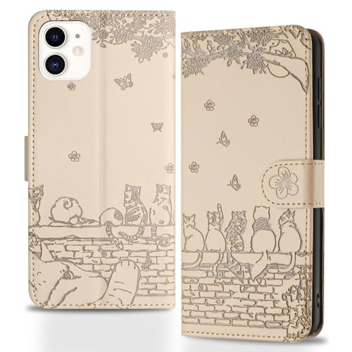 Butnyeoe Coque pour iPhone 11 Rabat,Housse Pochette iPhone 11 Clapet,Portefeuille Etui avec Porte-Carte et Dragonne,Chats/Fleur PU Cuir/Antichoc Flip Folio Case.Beige/Kaki