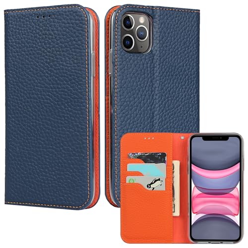 ELTEKER Etui Coque pour iPhone 11 [Housse en Cuir véritable] [RFID Blocage] [Emplacement pour Carte] [Béquille], Etui à Rabat Pochette Portefeuille pour iPhone 11-Bleu
