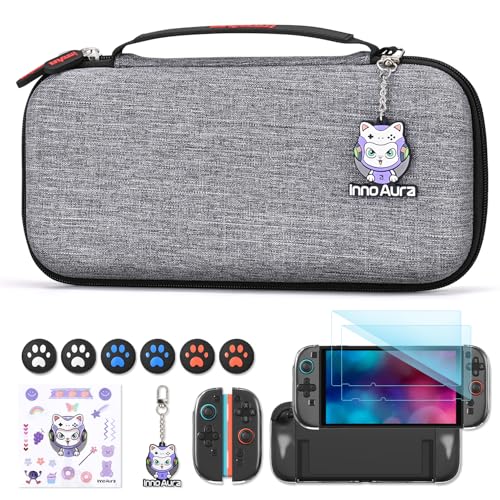 innoAura 14 en 1 Pochette Switch 2 pour NS Switch 2 (2025), Housse Switch 2 avec étui de transport, coque de protection, grips pour sticks, protection d'écran, pendentif mignon et autocollant, Gris