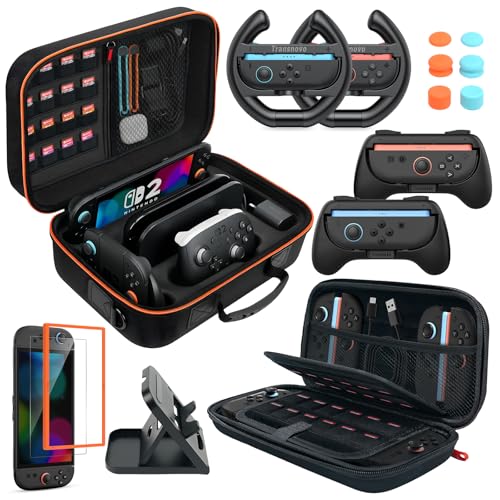 Kit d’accessoires 14-en-1 compatible avec Nintendo Switch 2 (2025), Grande Pochette Transport Switch 2 Rigide, Sacoche Switch 2 de Voyage, Verre Trempé, Grips pour Joycon, Volants & Accessoires Gaming