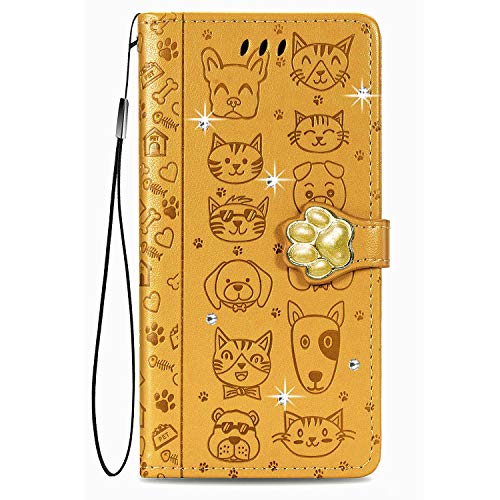Ucikov Pochette Téléphone pour Samsung Galaxy A13 5G, Chat et Chien Animaux Effet Paillette Coque Étui à Rabat en Cuir TPU Douce avec Dragonne et Béquille Fonction,Jaune