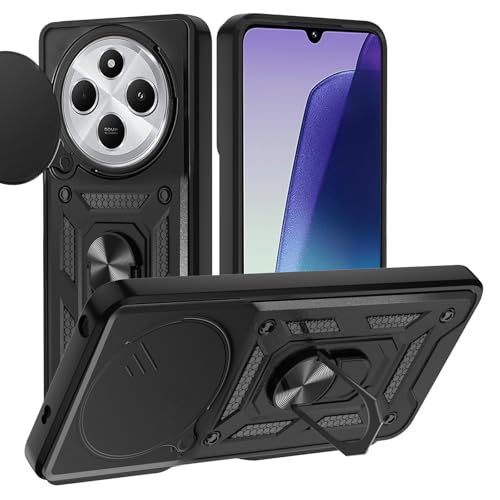 Coque pour Xiaomi Redmi 14C 4G/14 C/Poco C75 4G avec Couvercle Coulissant de Caméra, Étui de Support 360° Rotatif Anneau Militaire Dur PC Armor et TPU Silicone Antichoc Anti Rayures Housse, Noir