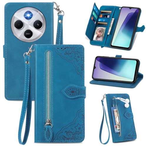 MOJIA Coque Porte Monnaie pour Xiaomi Redmi 14C 4G / POCO C75, Etui Portefeuille en Cuir PU avec Cover en TPU, Etui Multifonctionnel Porte-Cartes avec Dragonne. Bleu