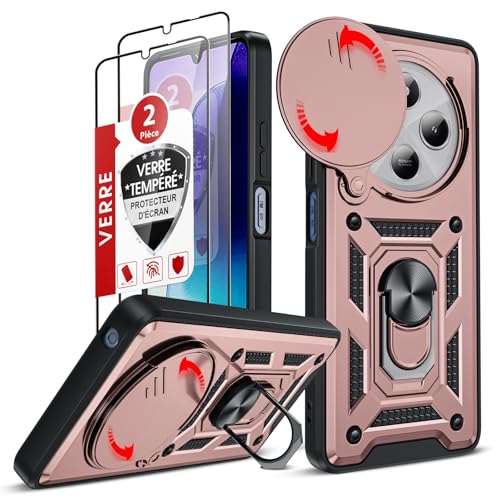 LeYi Coque pour Xiaomi Redmi 14C/14 C/POCO C75 4G Antichoc avec 2*Verre Trempé+Full Protection Caméra Coulissante,Anneau Support, Étui de PC Dur et TPU Silicone Militaire Anti-Rayures Coque,Rose