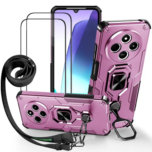 Lonjanfon Outdoor Coque avec Cordon pour Xiaomi Redmi 14C/Poco C75,Support 360°Rotatif,2 HD Verre Trempé, Militaire Antichoc Housse Etui pour Redmi 14C/Poco C75 5G/4G - Violet