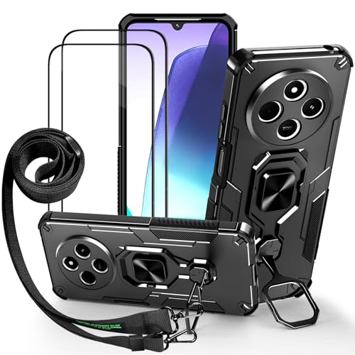 Lonjanfon Outdoor Coque avec Cordon pour Xiaomi Redmi 14C/Poco C75,Support 360°Rotatif,2 HD Verre Trempé, Militaire Antichoc Housse Etui pour Redmi 14C/Poco C75 5G/4G - Noir