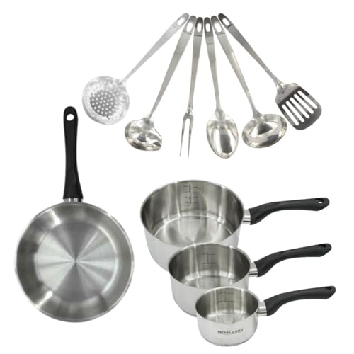Fackelmann 9446150 Set 1 poêle 20 cm, 3 casseroles en inox 18/8 et 6 ustensiles inox, tous feux, induction, sans PFAS, Acier inoxydable 18/8, 12 16 20 cm, Gris Argent