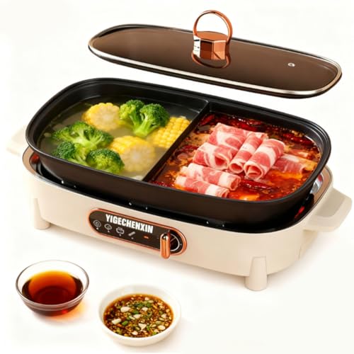 YIGECHENXIN Poêle électrique antiadhésive divisée 1350W, Casserole de Cuisson Multifonction sans cuisinière, avec Casserole Shabu Shabu et poêle à Griller, idéale pour Barbecue, hotpot et Soupe