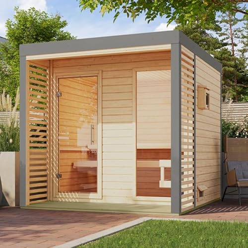 Karibu Hytti | Sauna Extérieur 5 Places en Bois Massif Épicéa Nordique 38mm | Gris Terre avec Poêle 9KW Contrôle Externe | Dimensions 231x196cm | Toit Plat, Porte Isolante