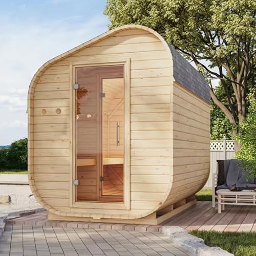 Karibu Sauna Extérieur Tonneau Asymétrique | 2-4 Places, Bois Massif Épicéa Nordique 38mm | Porte Vitrée, Toit Isolant, 199x175cm | avec Poêle Électrique en Option