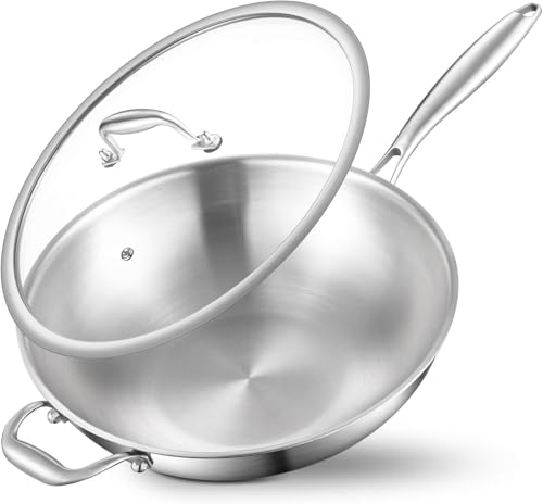 DELARLOCHEF Poêle wok non revêtue avec couvercle et poignées : 3 couches en acier inoxydable de 33 cm, sans PFOA, sans PTFE, passe au four jusqu'à 400 °C
