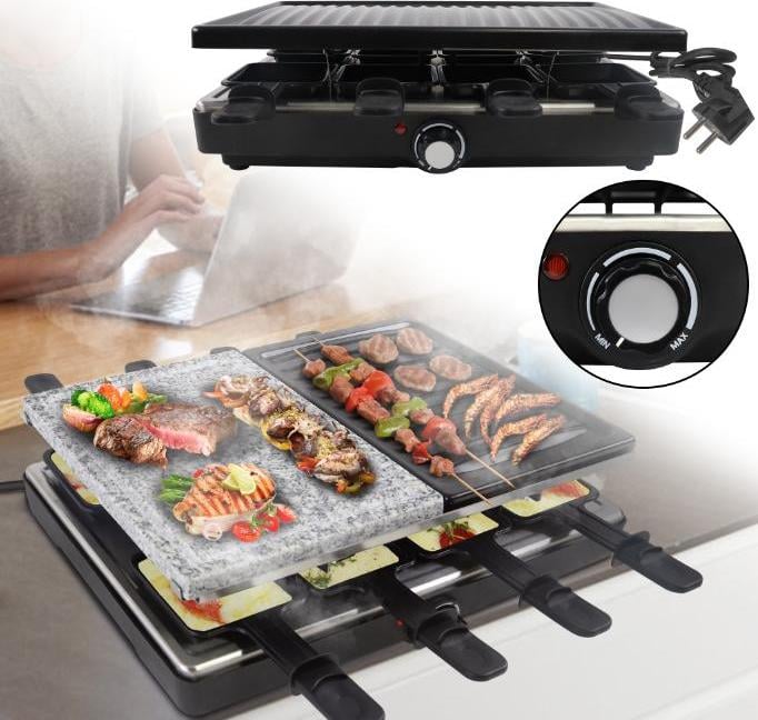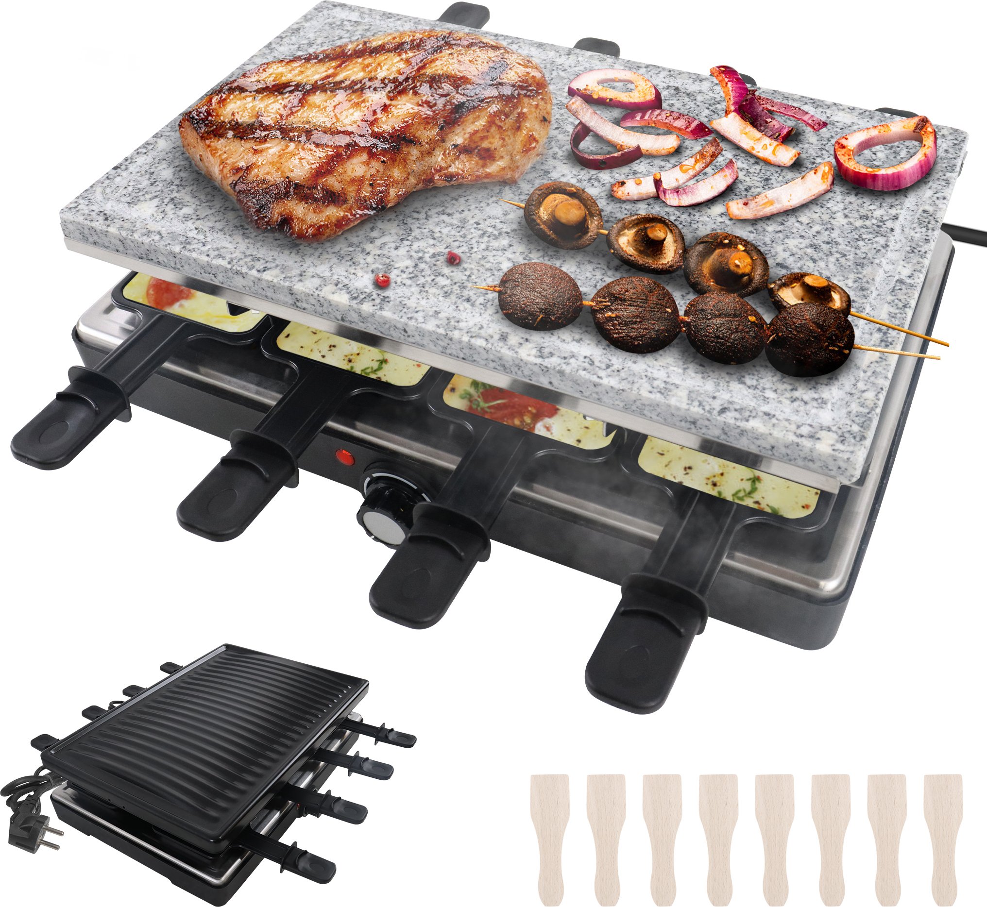 Skive Raclette Grill avec plaque en pierre naturelle, gril de table pour 8 personnes, 1400W, avec poêlons, gril de fête pour le jardin, comme fondue, comme gril électrique