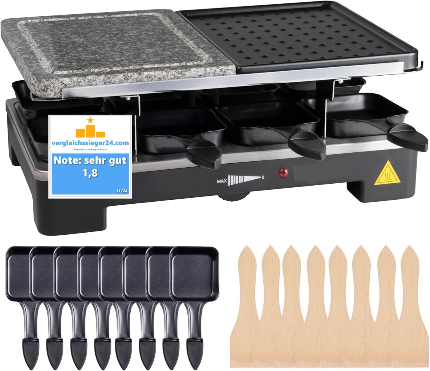 LARS360 Gril à raclette avec pierre naturelle et plaque de gril pour 8 personnes Température réglable en continu 1400W avec 8 poêlons & spatule en bois