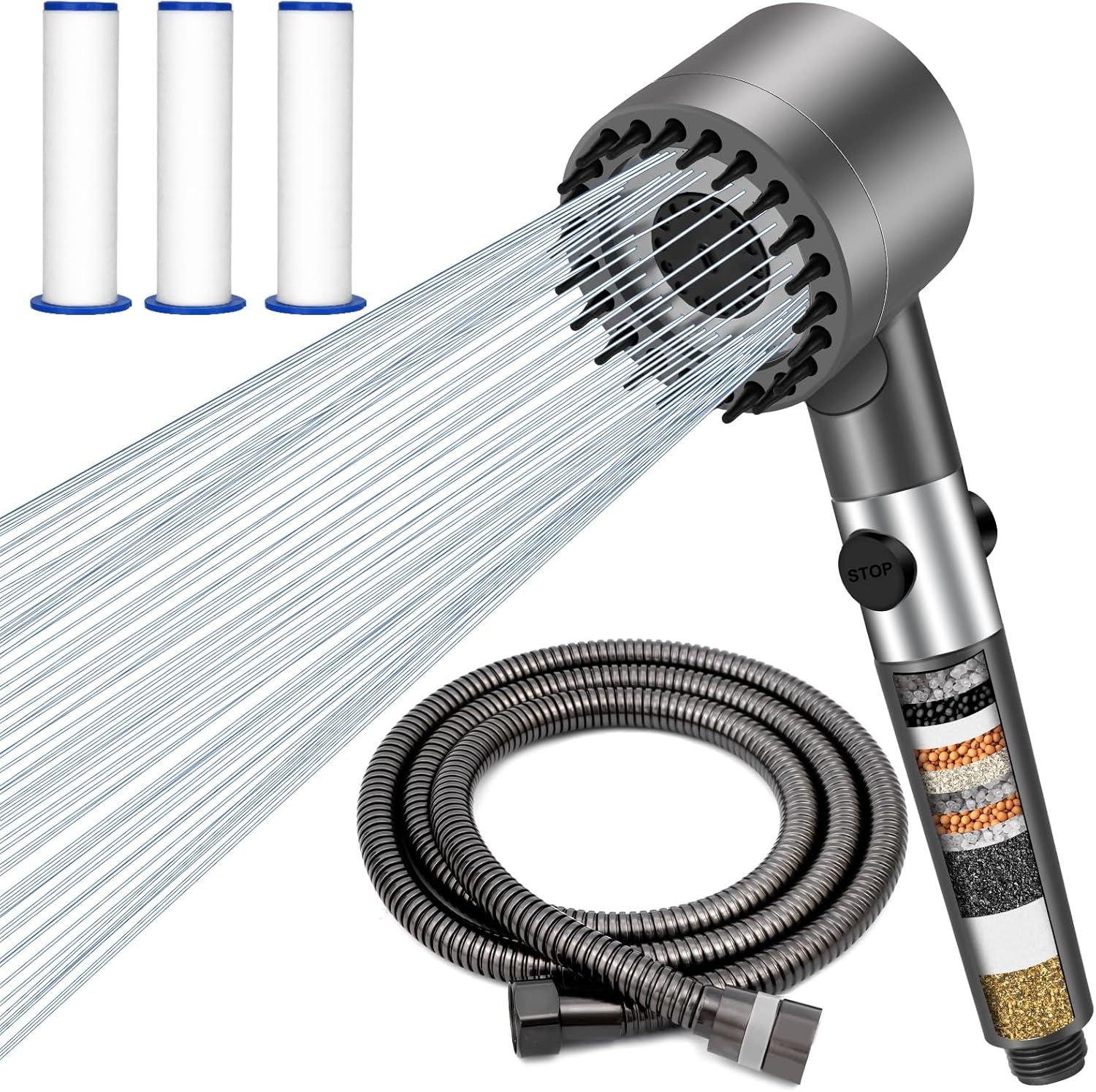Pommeau de douche filtrant anticalcaire - Pommeau de douche haute pression avec flexible de 2 m, poire de douche à économie d'eau, ensemble de pommeau de douche filtrant pour salle de bain avec arrêt d'eau
