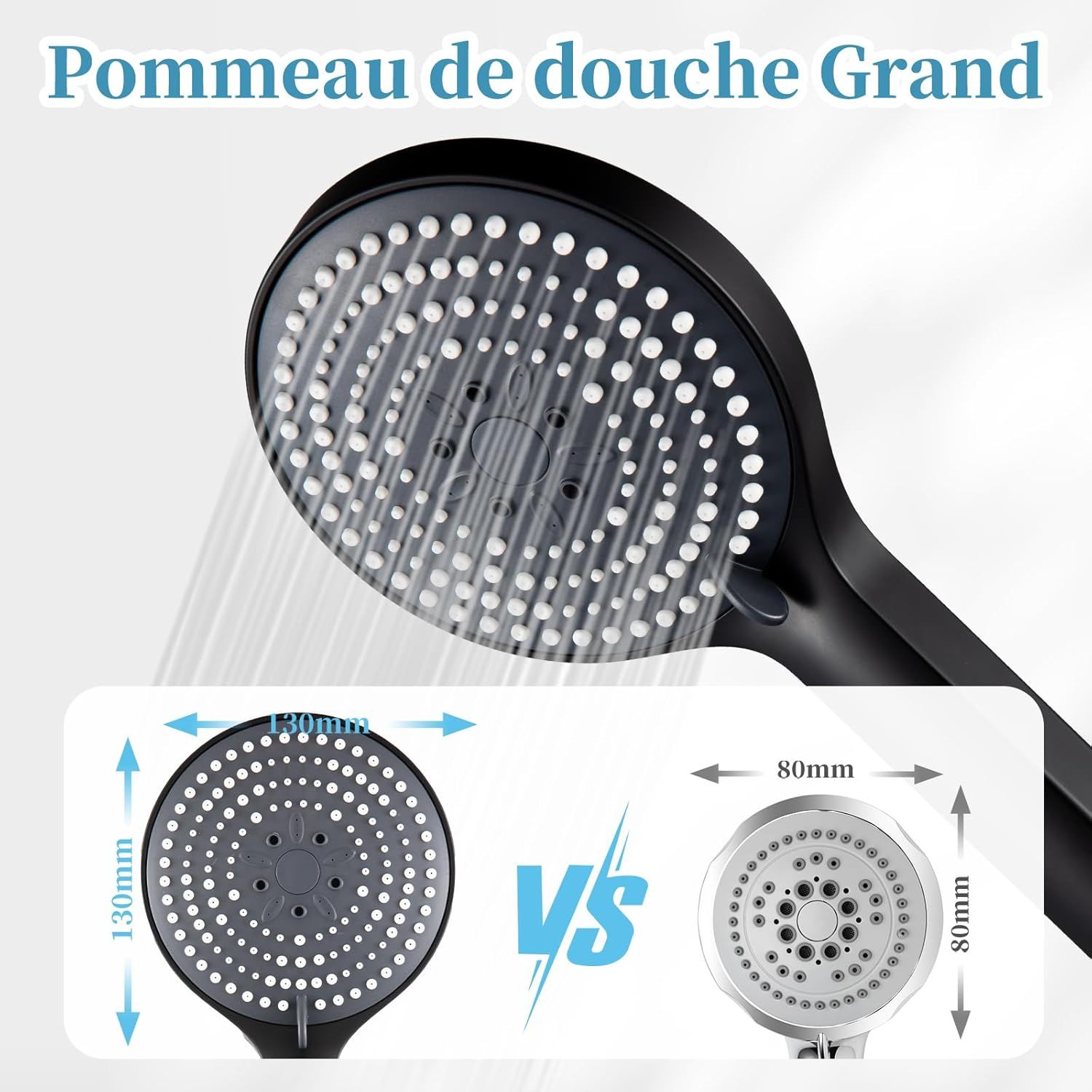 Pommeau de Douche,Douchette,Avec 6 modes de massage pulvérisation,Pommeau de Douche économie d'eau,Tête de Douche,Poire de Douche,Grande xxl(¿130mm),Noir Mat