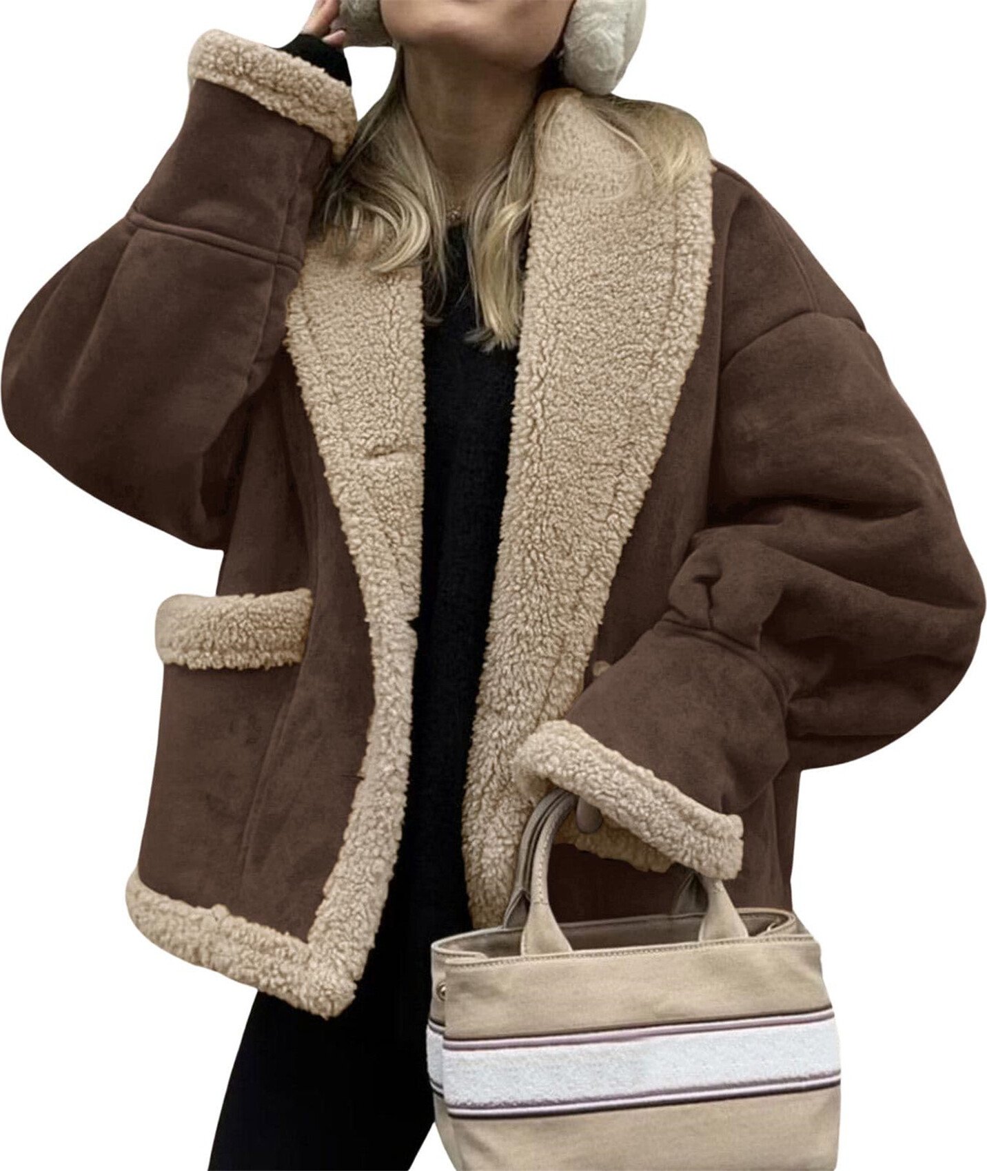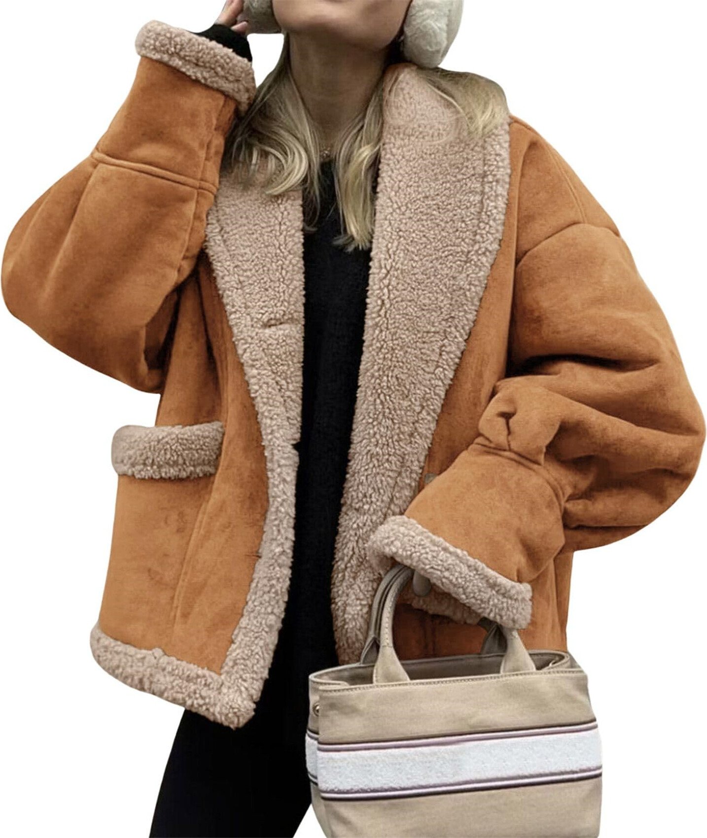 ASKSA Femme Veste polaire oversized Veste d'hiver Doublure Sherpa Chaud Patte de boutonnage Revers Veste courte Vintage Manteau en faux daim Veste en peluche (Marron,S)