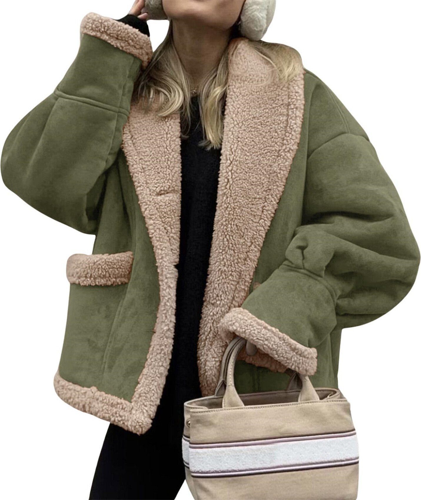 ASKSA Femme Veste polaire Oversized Doublure Sherpa Chaude Patte de boutonnage Revers Veste courte Vintage Manteau en faux daim Veste en peluche (Vert,S)