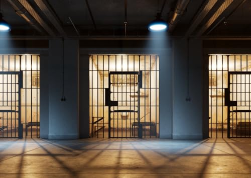 CORFOTO 3.5x3m Toile de Fond de Prison, Couloir de Cellule de Prison, décorations de fête sur Le thème du Crime et du Meurtre, Toile de Fond de fête de la Police et des Gangsters