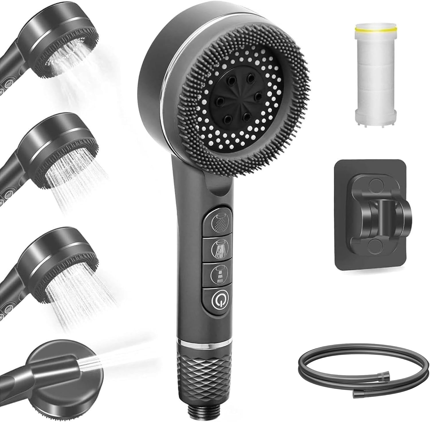 JGD-Pommeau de Douche Anti Calcaire, 4 Types de Jets Pommeau de Douche Haute Pression avec Tuyau Douche 1.5M et Support de Douche, Pommeau Douche Economie, pour l'eau dure (Dark grey)