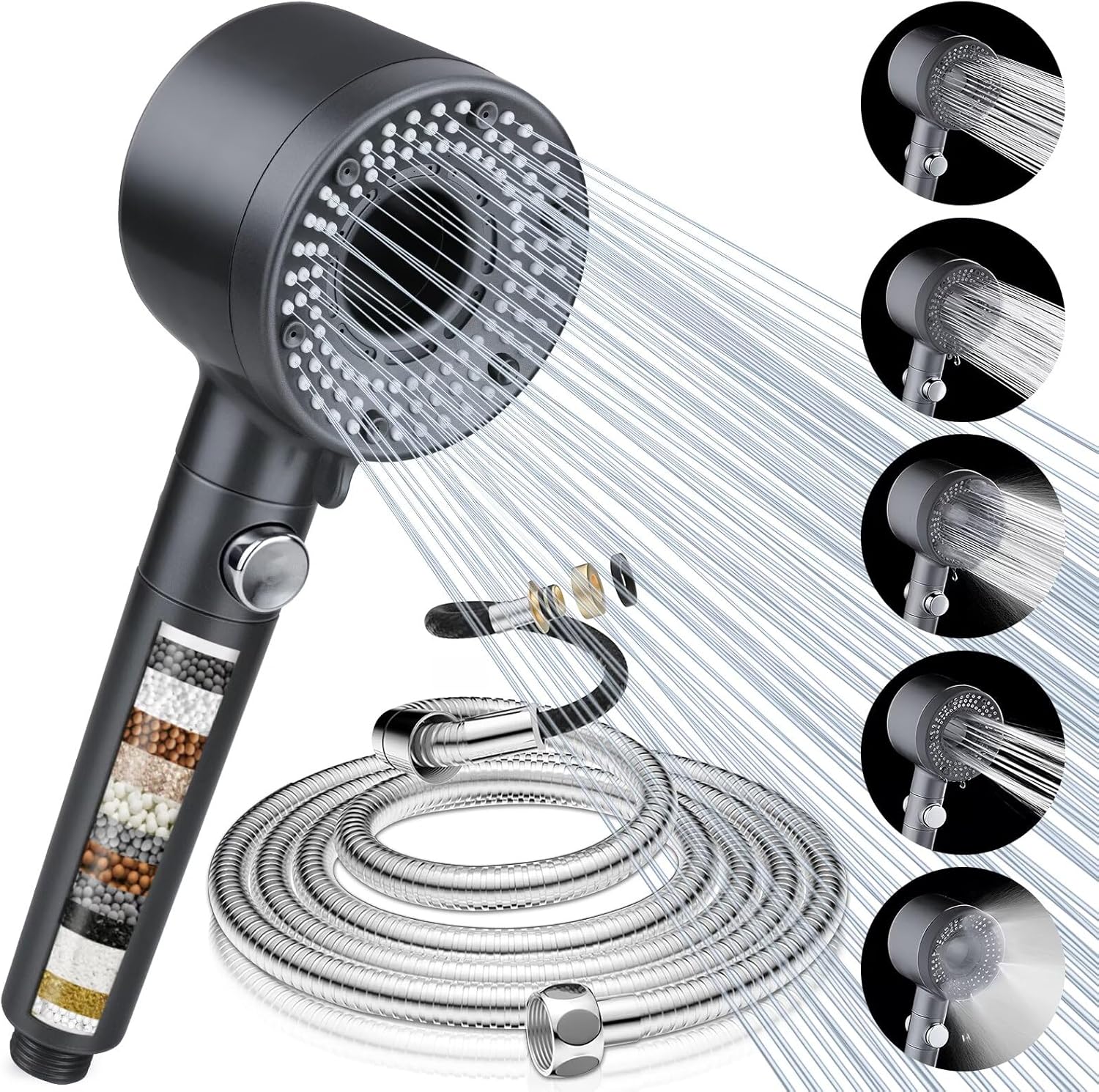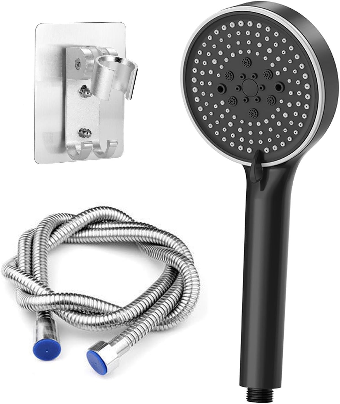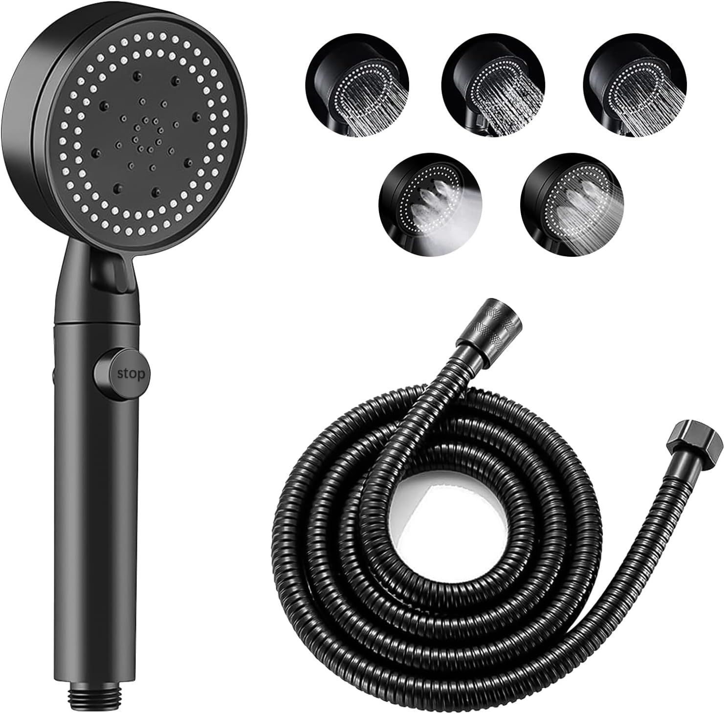 Pommeau de Douche Haute Pression 5 Modes Pommeau de Douche avec 1.5 Tuyau Douche, Universel Pommeau de Douche Economie Deau Douchette Douche Salle de Bain Arrêt à un Bouton(Noir)