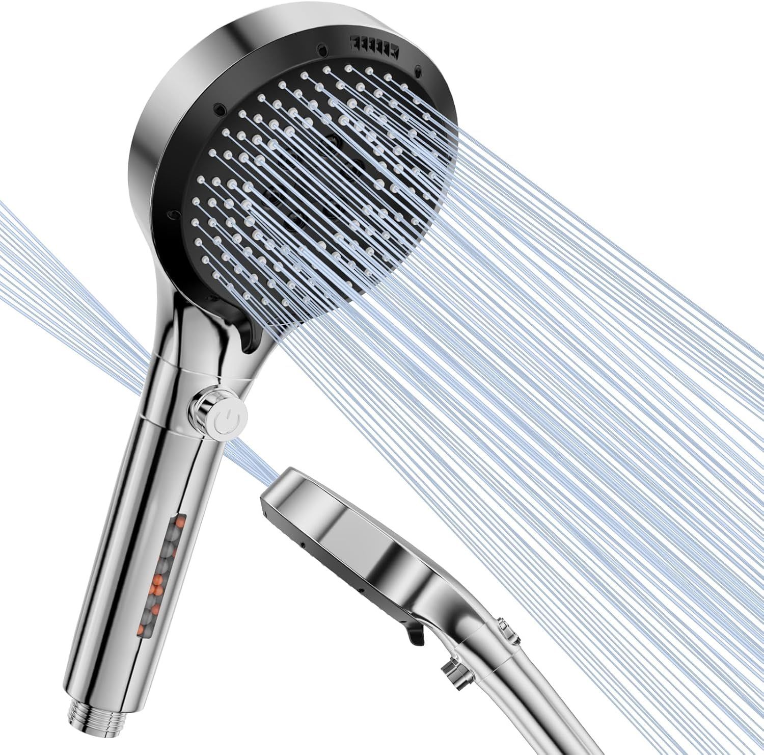 Vinabo Pommeau De Douche Anti Calcaire Haute Pression, Douchette Douche Salle De Bain Avec 6 Types De Jets, Pommeau De Douche Economie Deau Avec Bouton D'ArrêT D'Eau (Argent/Chrome)
