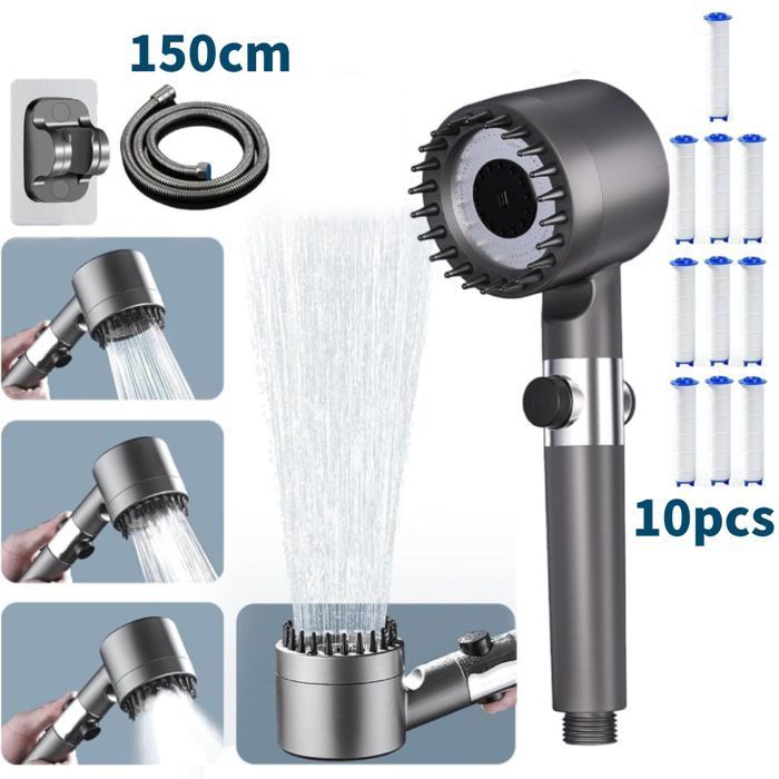 Pommeau de douche haute pression économique 4 jets + flexible 15m + support + 10 cartouches - Pommeau SPA filtre