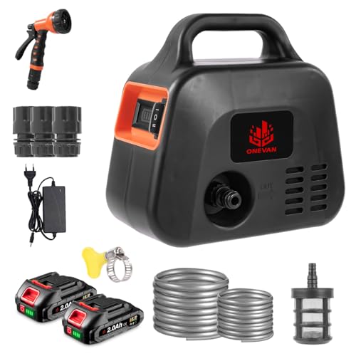 ONEVAN pompe à eau sur batterie, 600L/h pompe de jardin sans fil avec 2 batteries de 2000 mAh, indicateur de charge, 2 vitesses, pompe arrosage électrique inclus buse 7 en 1, tuyau et filtre