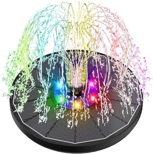 Fontaine Solaire LED Colorées, 2025 Upgrade 3W Fontaine Solaire Pompe avec 1500mAh Batterie, Flottante Pompe Bassin Solaire avec 6 Buses pour pour Bain d'oiseaux, Étang, Piscine, Patio