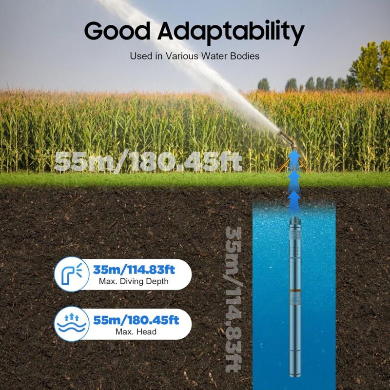Pompe Immergée pour Puits Profond, 370W, Débit 1000 L/h, Hauteur 55m, Silencieux (0-30dB), Pompe de Puits Submersible IP65, pour Irrigation Agricole