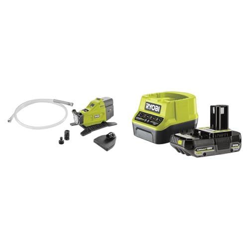 Ryobi - Pompe de transfert 18V - 1 500 L/h - aspiration 2,5 m - levée 14 m - Livrée avec 1 tuyau 2,5 m, 1 raccord rapide 18 mm, 1 adaptateur, 1 filtre, 1 batterie 2Ah et 1 chargeur rapide