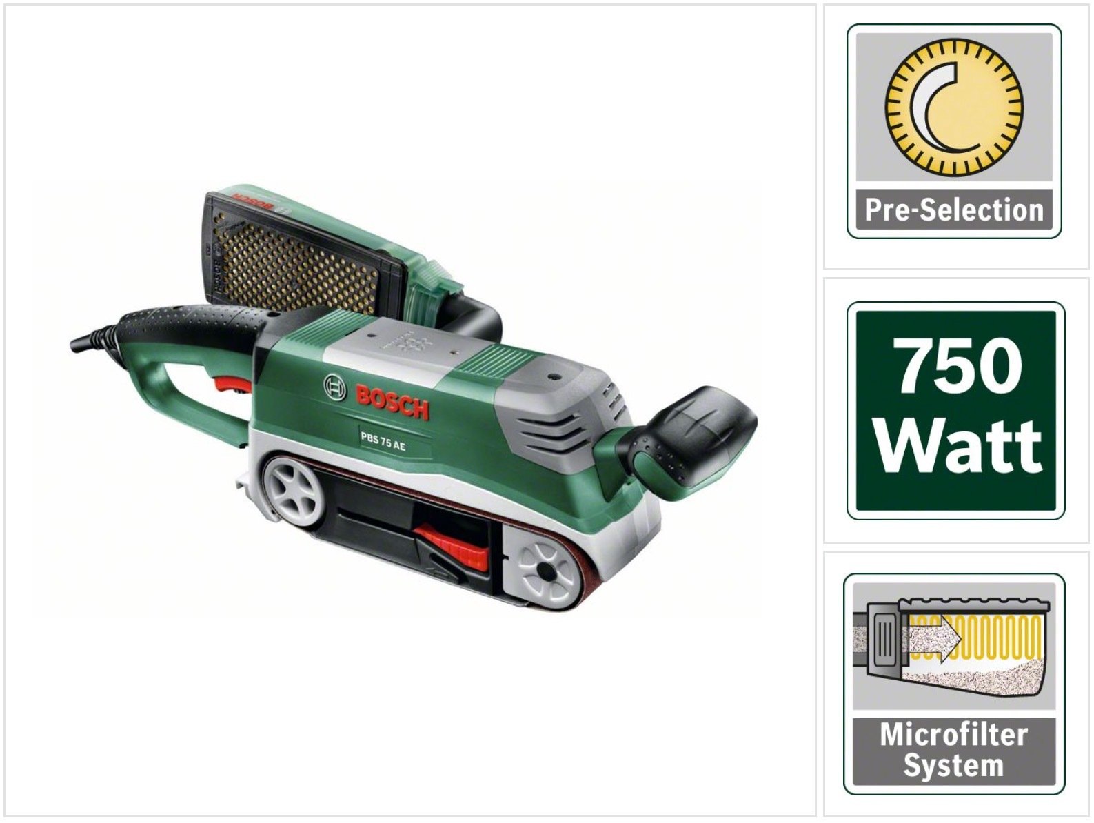 Bosch ponceuse à bande PBS 75 AE Set (750W, vitesse de bande 200-350 m/min, surface de ponçage 165x76 mm, emballage coffret)