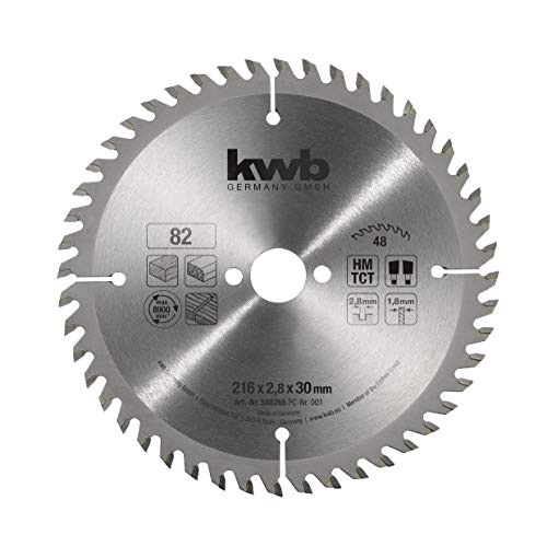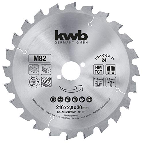 kwb Lame de scie circulaire professionnelle pour panneaux de particules, lame de scie pour bois/bois dur, 216 x 30 mm, coupes nettes, nombre moyen, 24 dents Z-24, Made in Germany