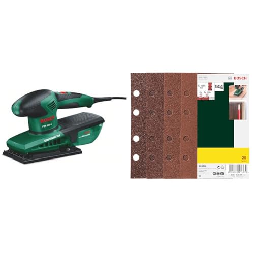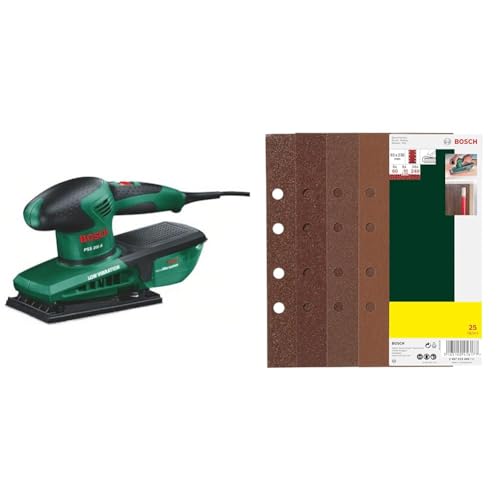 Ponceuse vibrante Bosch - PSS 200 A (livrée dans un coffret avec 1 feuille abrasive Red Wood P120 et un microfiltre) + Lot de 25 disques abrasifs (G 40, G 60, G 80, G 120)