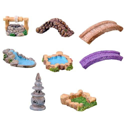 SEWACC Décor Miniature Résine pour Jardin Mini-Pont Et Bassin d'eau, Ensemble De 8 Pièces Artisanales Vintage, Ornement Paysager Extérieur pour Aménagement Et Décoration Jardin