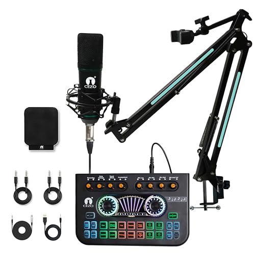 CEZO Microphone à condensateur professionnel avec carte son X3 | Ensemble de micro à condensateur avec bouclier anti-pop | Carte son en direct | Bras de perche RVB | Support antichoc | Support mobile